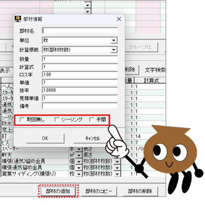 【坪拾い】部材登録の「取回無し」「シーリング」「手間」チェックについて