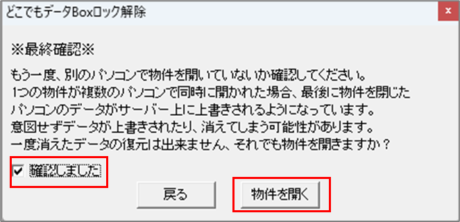 最終確認画面が出ますので、文章を読み「確認しました」のチェックを入れて【物件を開く】を押してください。物件が開きます。