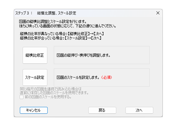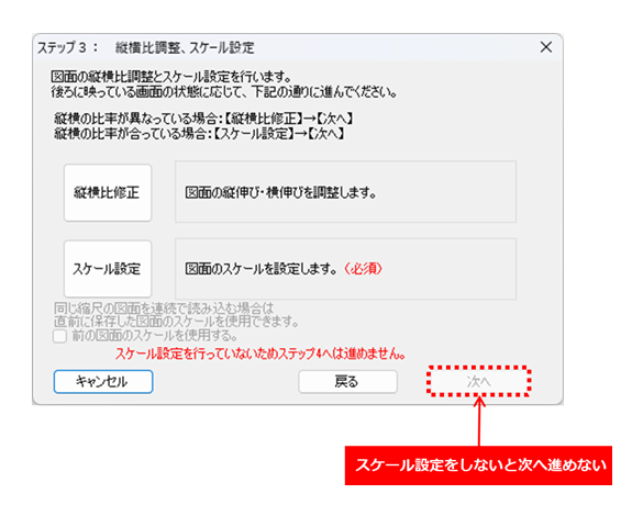 チェックを入れると、スケール設定が行われていない場合に警告が表示され、先のステップへ進めなくなります。チェックを外すと、設定していなくとも次のステップに進めてしまいます。