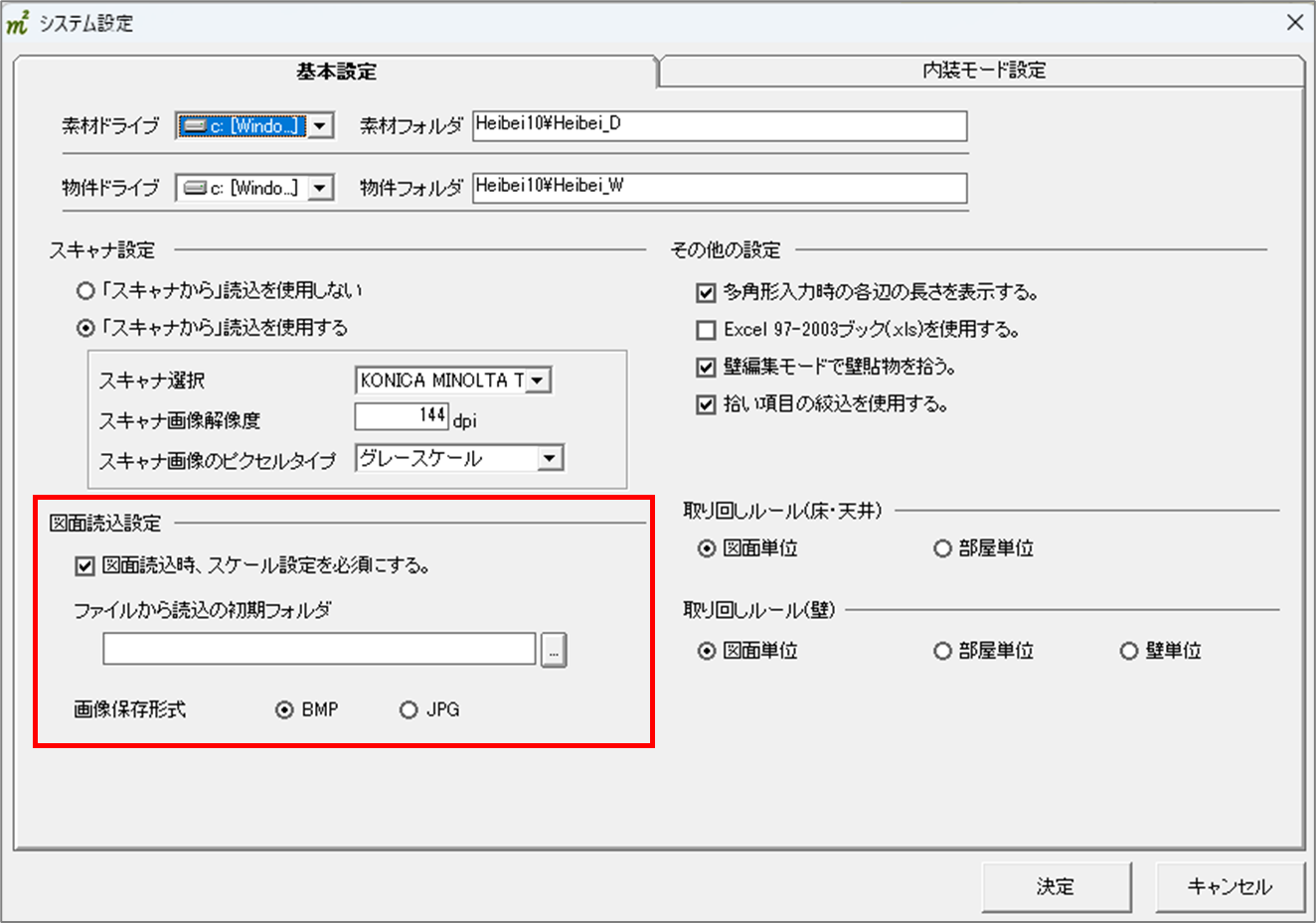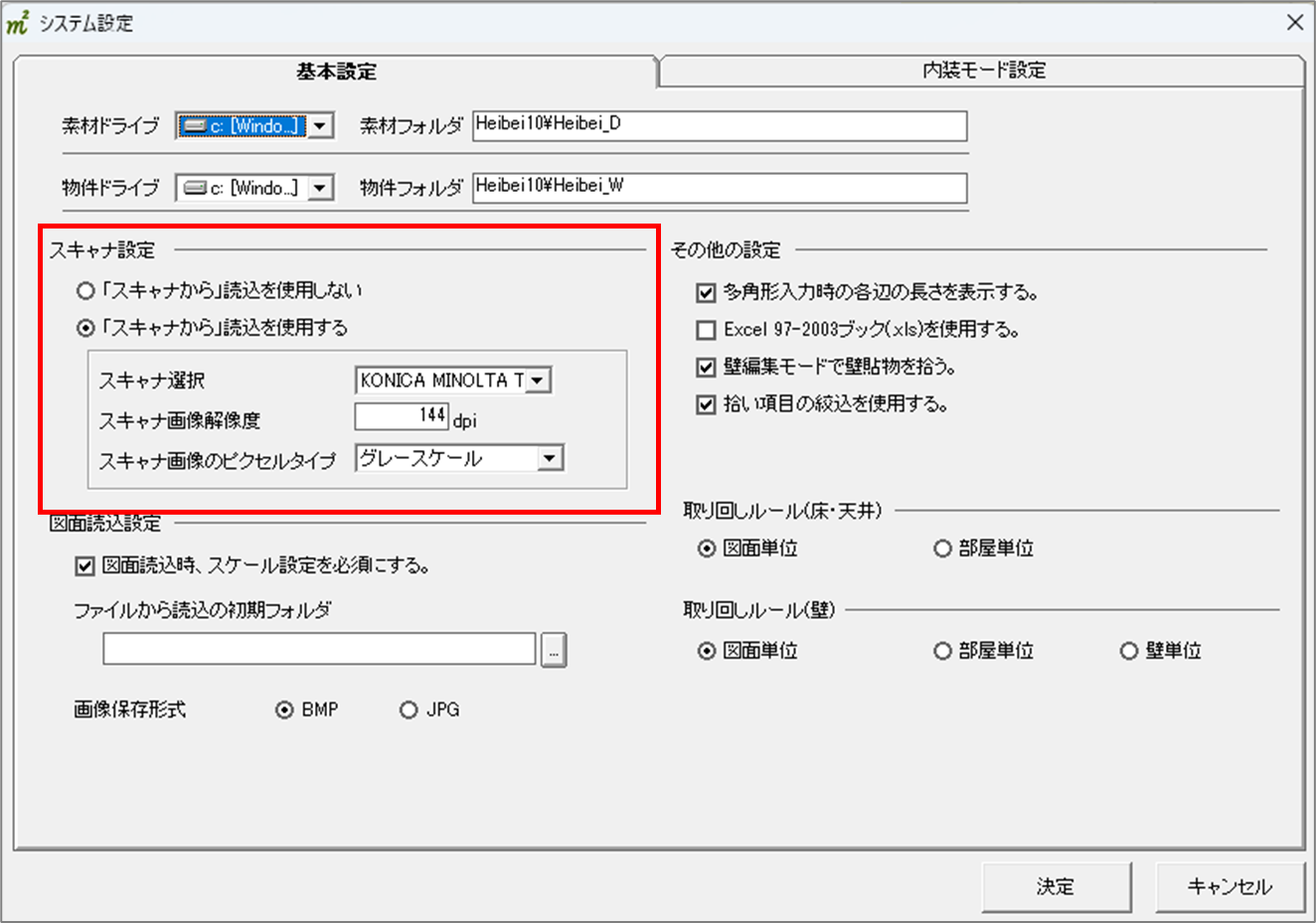図面読込時の「スキャナから」読込(坪拾いから直接スキャナを呼び出して図面を取り込む機能)に関する設定です。