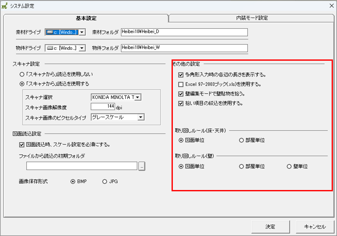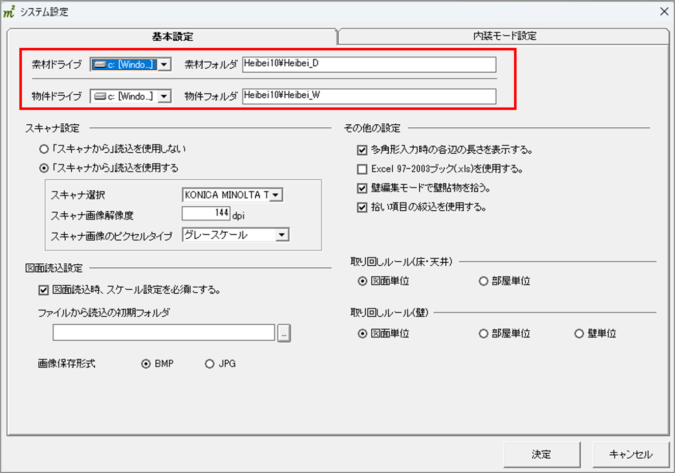 素材(部材登録)のデータと物件データの保存先を決める設定です。