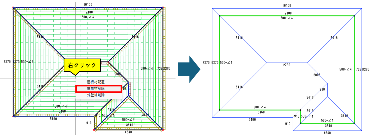 まずは屋根材を削除し、屋根伏せ図だけの状態に戻します。