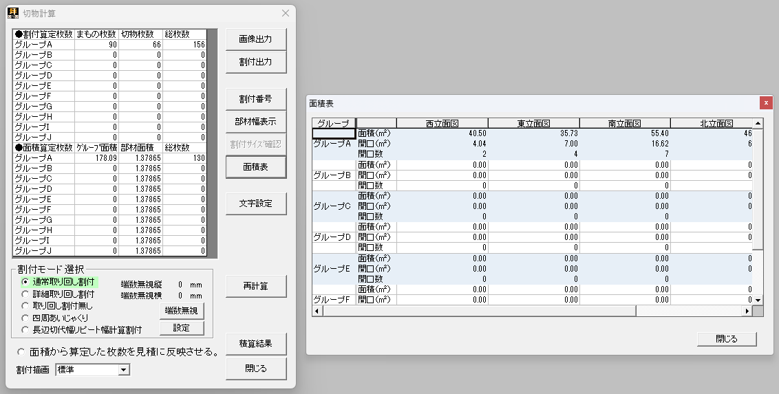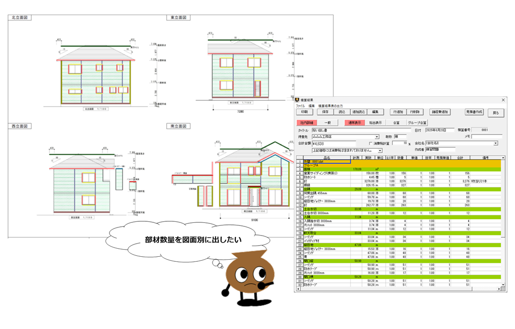 通常は全図面が一緒に集計されますが、今回は各面の数量で積算したい、とのこと。