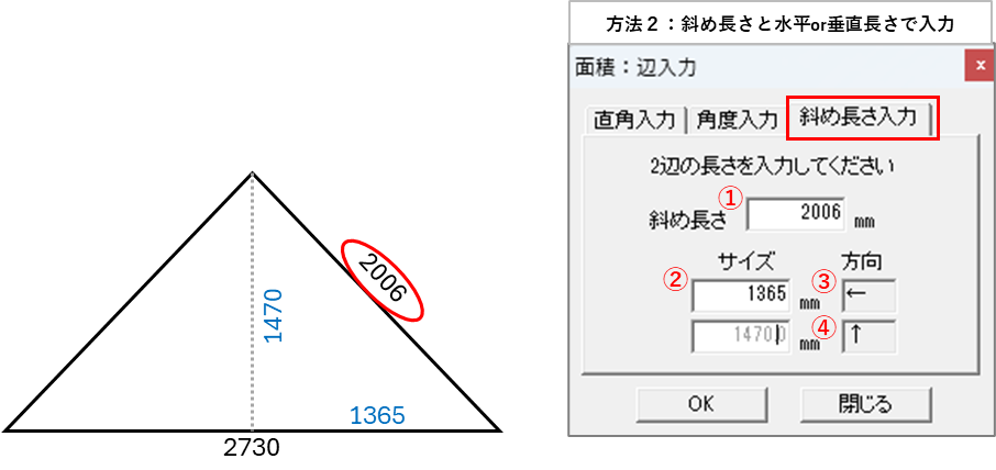 斜め線長さと水平(or垂直)距離をもとに入力します。