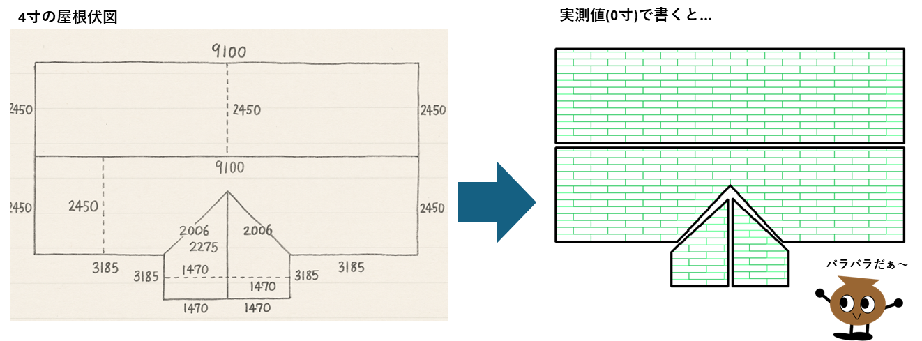 たとえば左のような4寸の屋根伏図も、実測値で面を書くと右のようにバラバラになります。