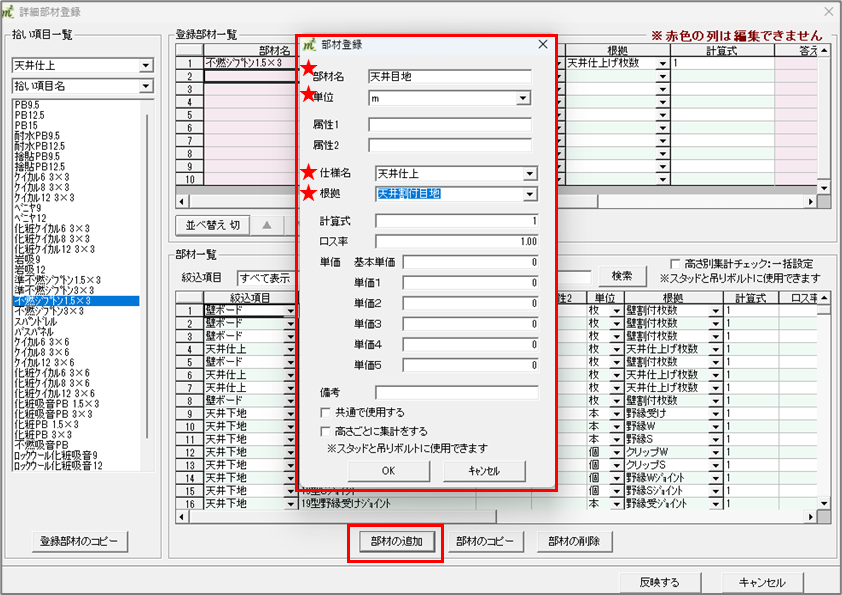 部材名は任意の名前、単位は「m」、仕様名は「天井(床)仕上」、計算根拠は「天井(床)割付目地」を設定してください。