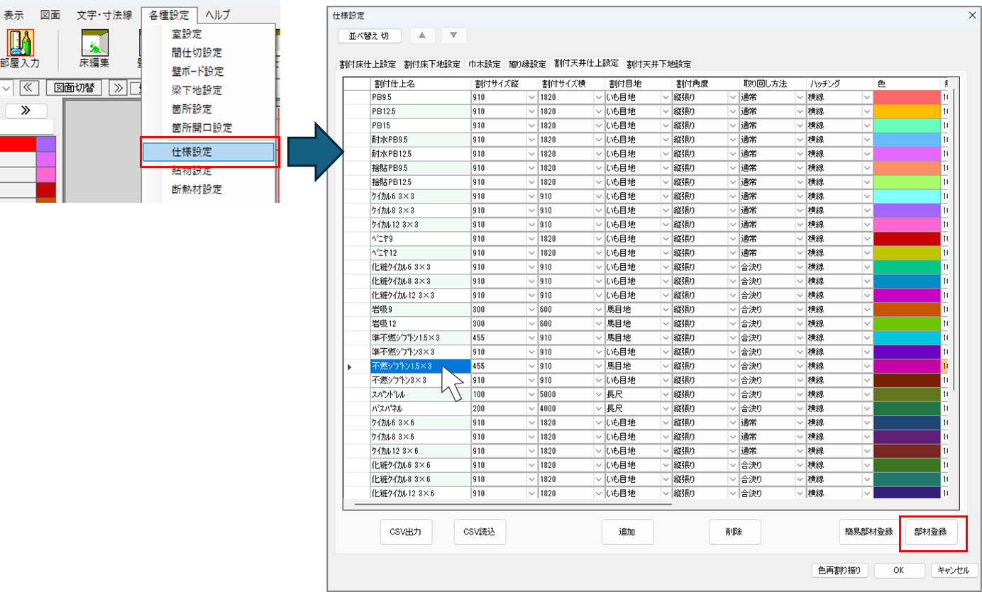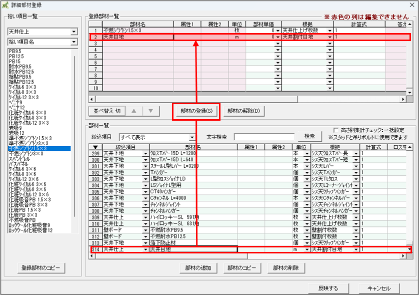 割付天井(床)仕上設定を開き、目地長さを拾いたい項目をクリックし、【部材登録】に進みます。