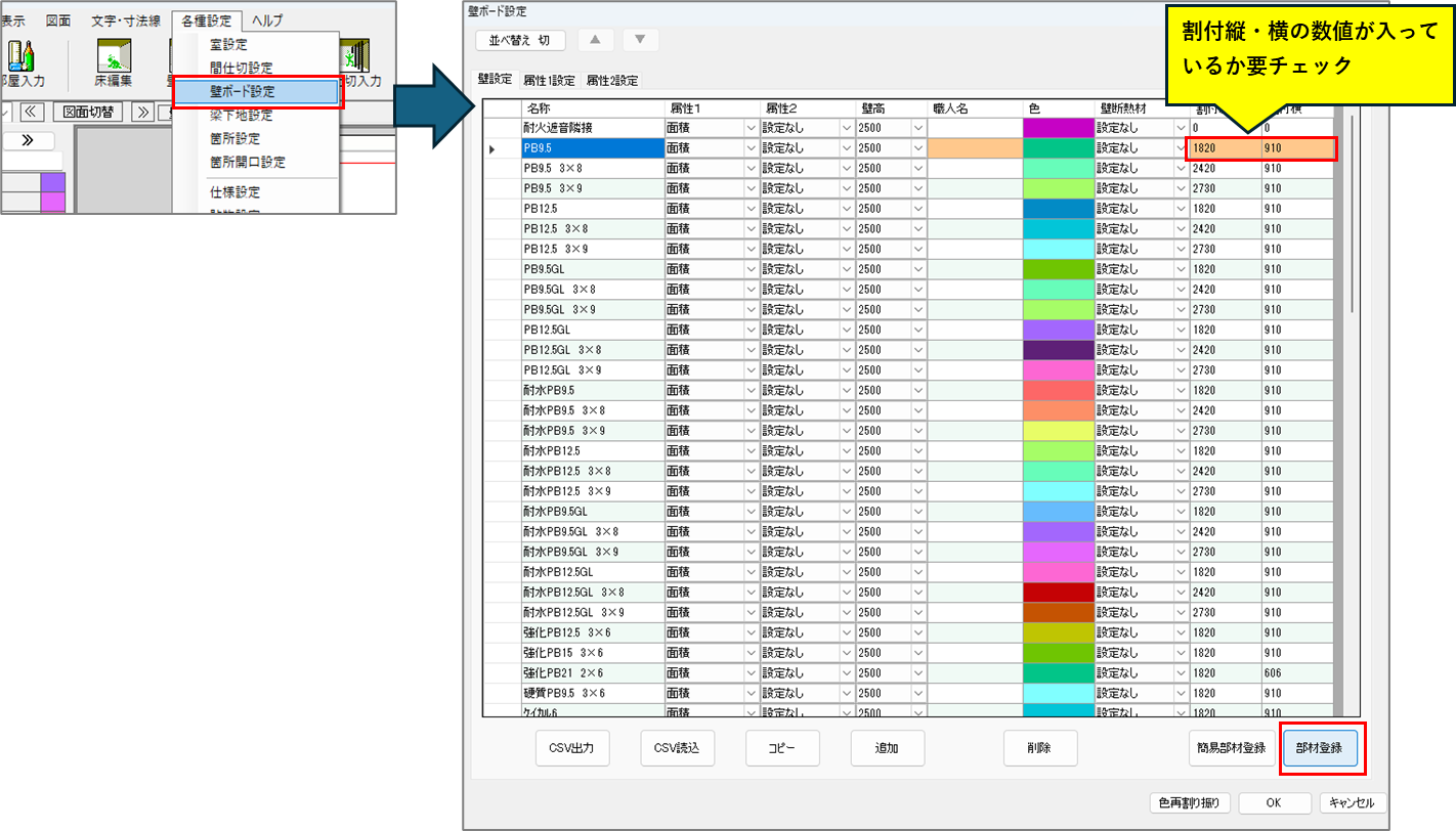 部材名は任意の名前、単位は「m」、仕様名は「壁ボード」、計算根拠は「壁割付縦目地」を設定してください。