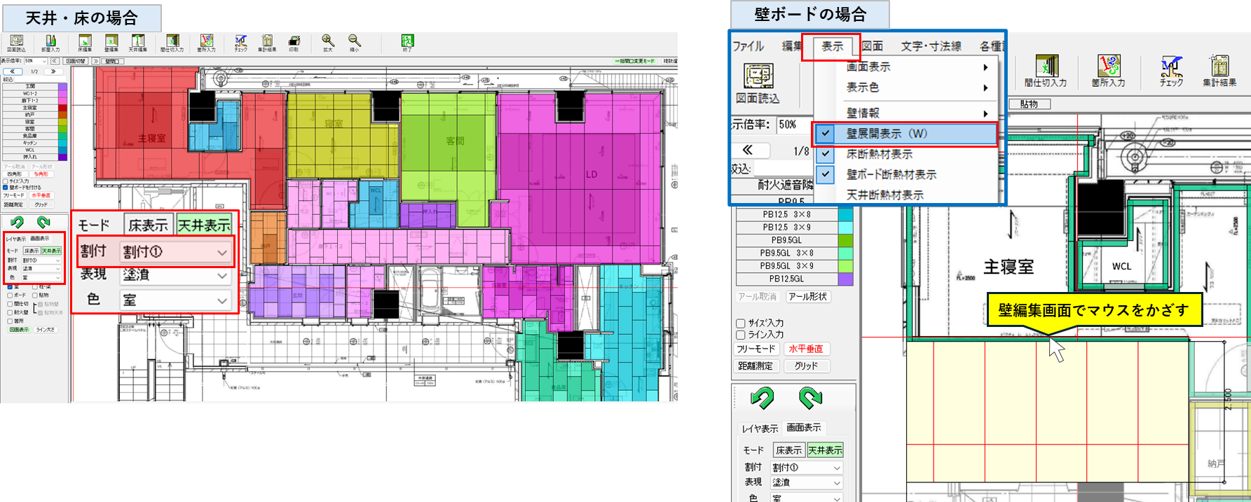 割付は天井・床の場合は画面表示から割付①~③の表示に切り替える、壁ボードの場合は壁編集画面で壁展開図を表示させることで確認できます!