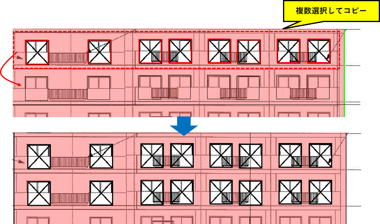 <コピーにもメリットがあります。今回はマンションの立面図を例にそれぞれのメリットとデメリットをご紹介します。これをふまえて、どちらの機能を使うかを検討してみてください。
