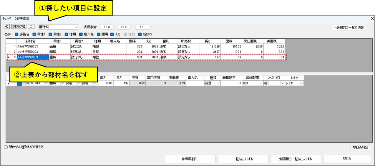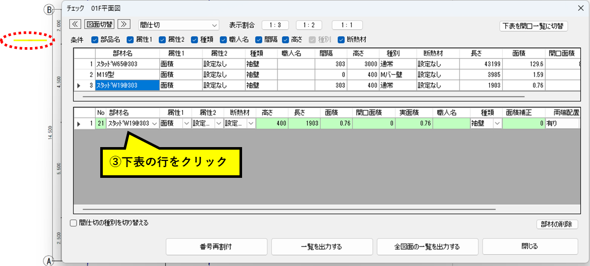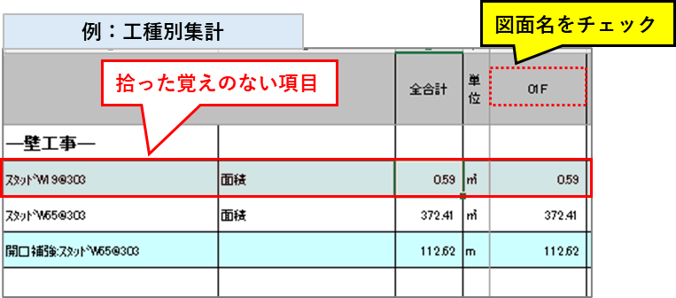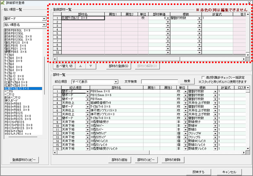 部材拾い集計に不要な行が出ている場合は、上記の原因以外に部材登録が誤っている可能性も考えられます。上記で解決しない場合は、詳細部材登録画面もご確認ください。