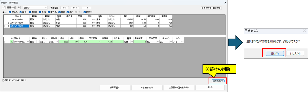 ※部材が何行か出ている場合は、1行ずつ削除してください。