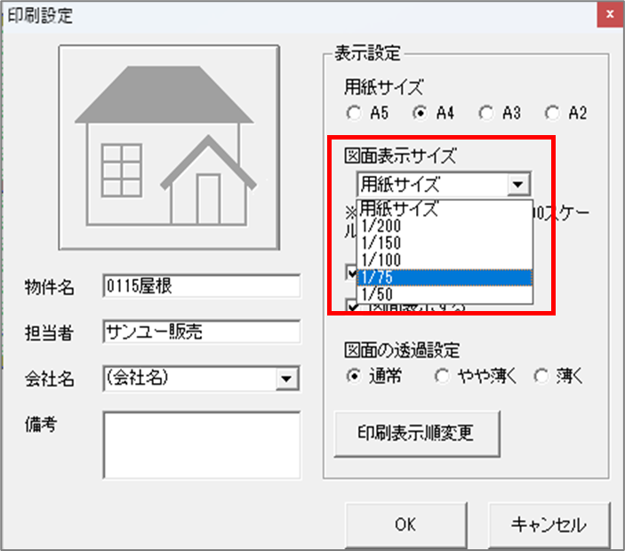 印刷プレビューを出す前の印刷設定で、図面表示サイズを調整する方法です。