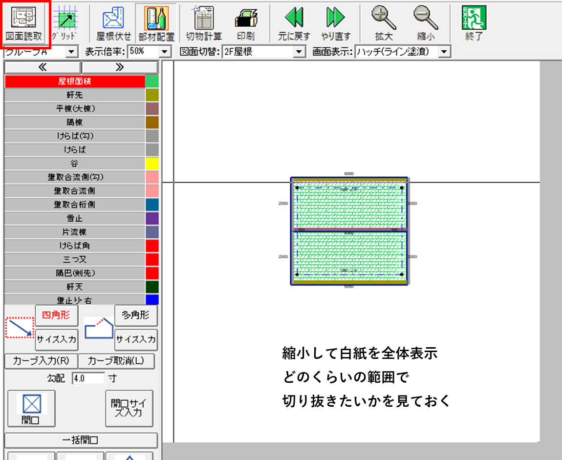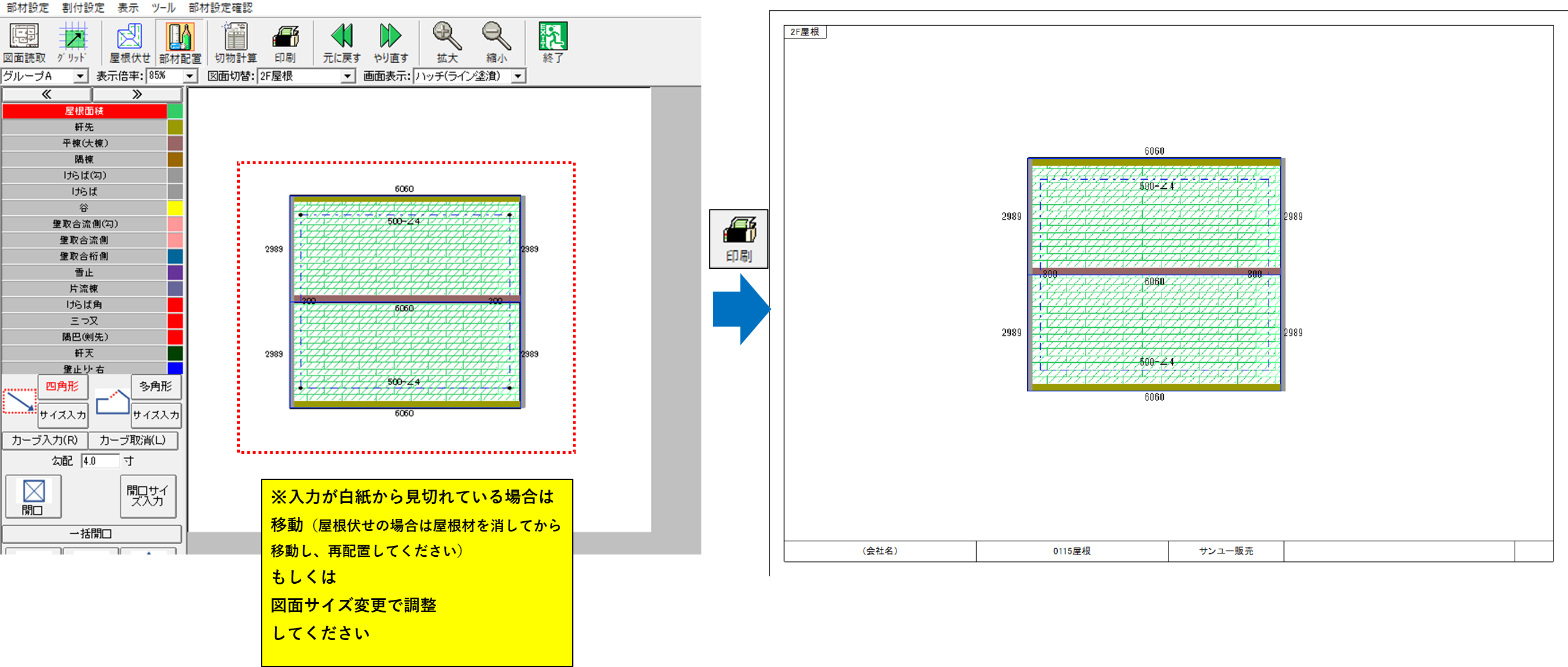 もしここで入力が白紙からはみ出してしまった場合は、入力物を移動してください。(屋根伏せの場合は屋根材を削除してから移動→屋根材を再配置してください)