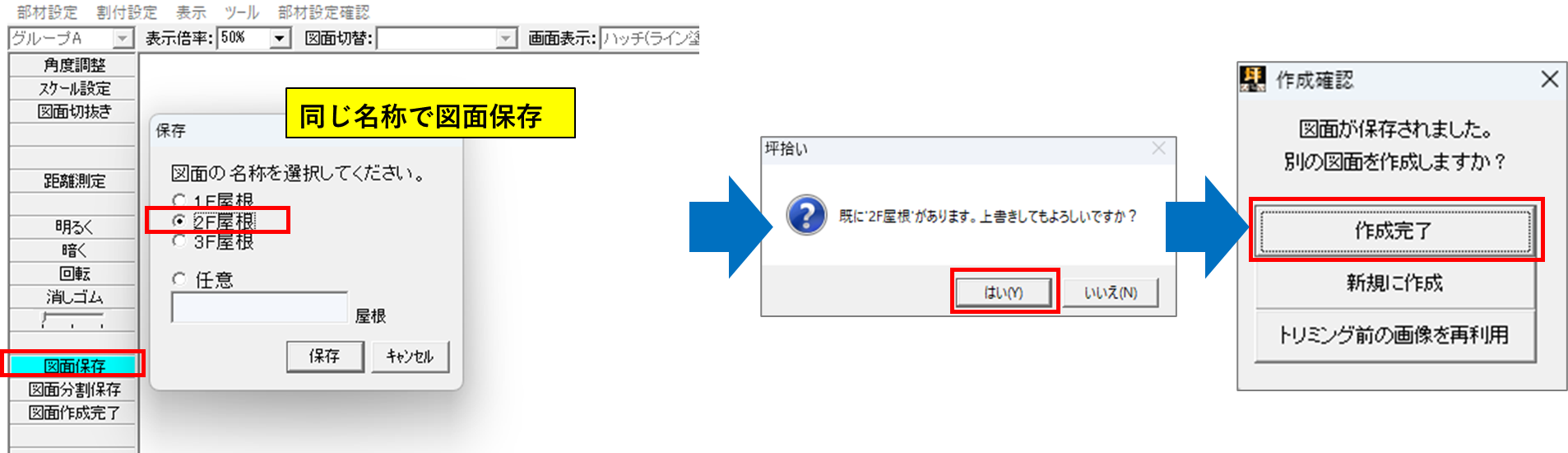 切り抜きできたら【図面保存】を押し、同じ名称で上書き保存してください。
