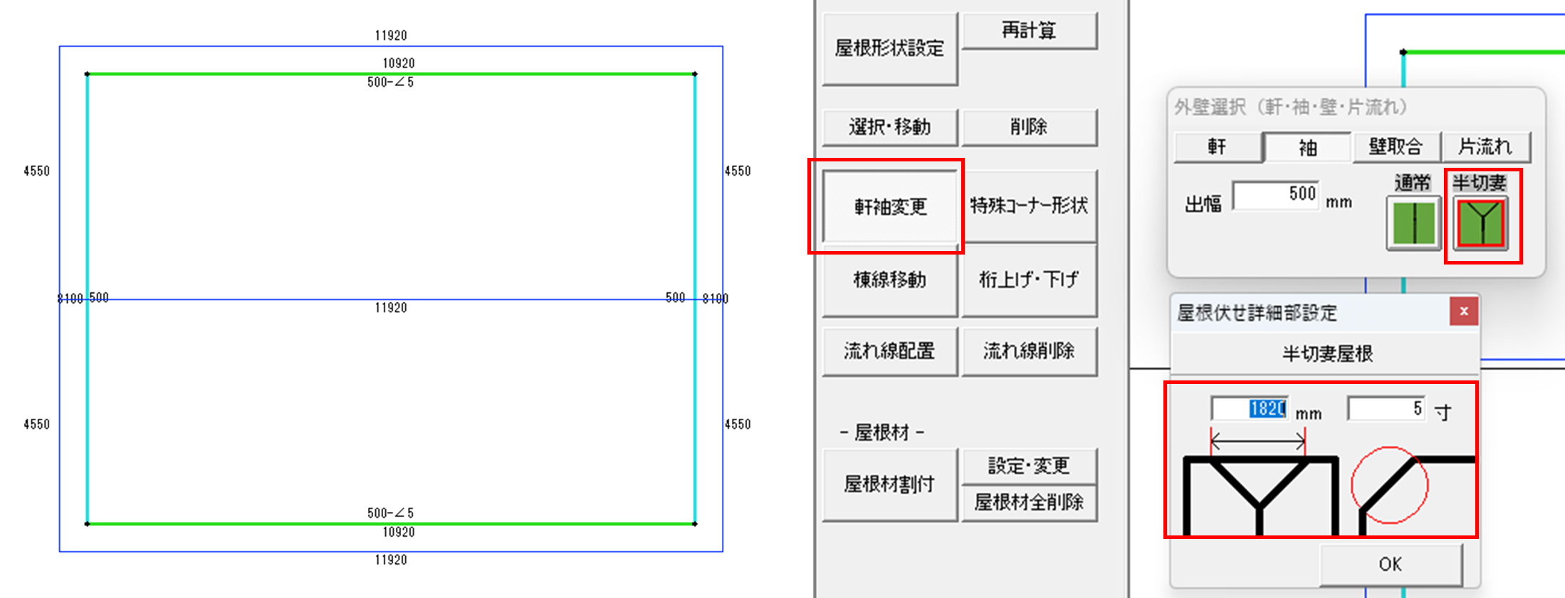 【軒袖変更】で「袖」を選び、その中の「半切妻」を選択します。