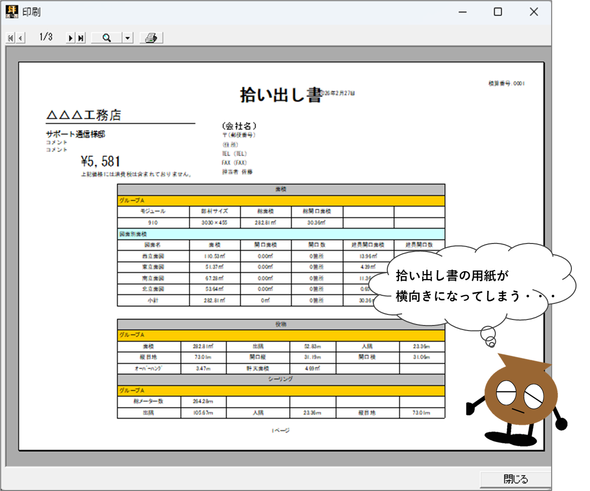 坪拾いから拾い出し書を印刷しようとすると、用紙が横向きになってしまう!設定を縦に印刷しても直らない!という問題が起こってしまった時の原因と対処法をご案内します。