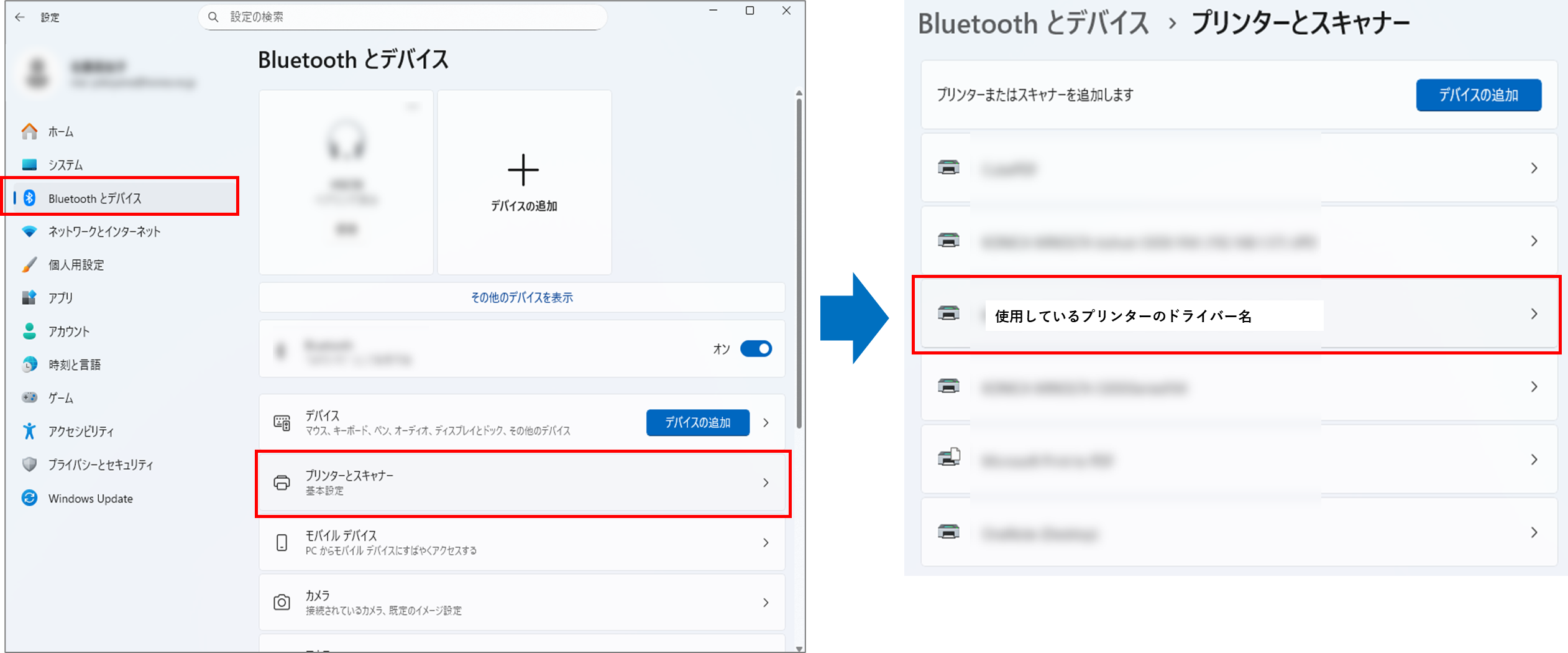 [Bluetoothとデバイス]から[プリンターとスキャナー]に進みます。