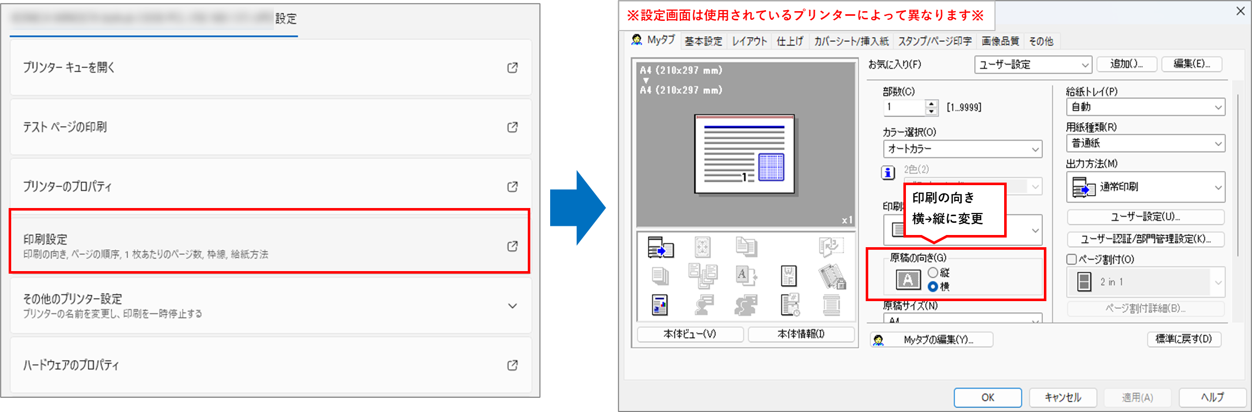 原稿の向きの設定が「横」になっている場合は「縦」に変更してください。