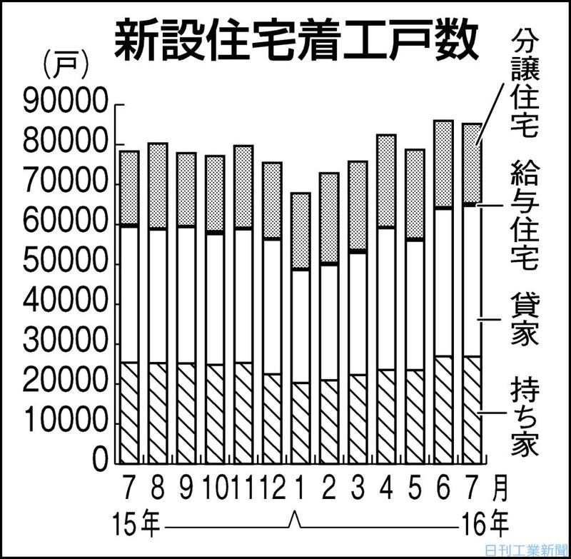 分譲住宅は同9・1%増の1万9897戸。内訳は一戸建てが同12・1%増の1万1863戸と9カ月連続プラス。マンションが同5・9%増の7863戸と、3カ月ぶりにプラスだった。