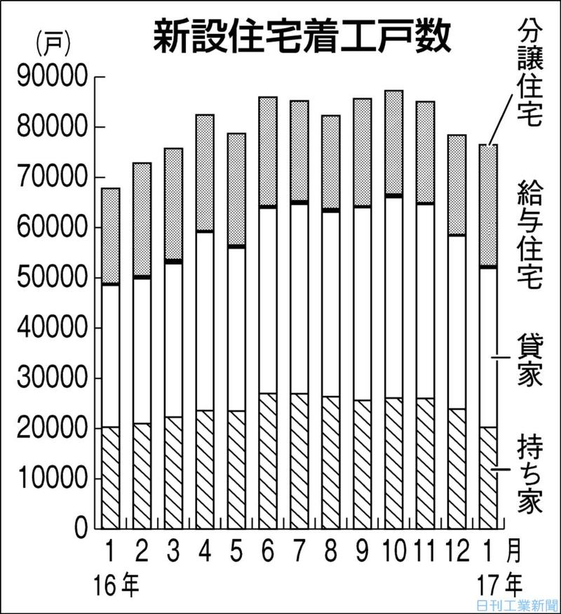 利用関係別戸数を見ると、「持ち家」は前年同月比0・2%減の2万228戸で12カ月ぶりに減少した。一方、「貸家」は同12・0%増の3万1684戸で15カ月連続の増加、「分譲住宅」は同27・3%増の2万4061戸で2カ月連続の増加だった。